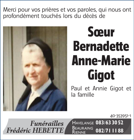 Décédée à Habay (6720) le mercredi 20 janvier 2021 à l'âge de 82 ans