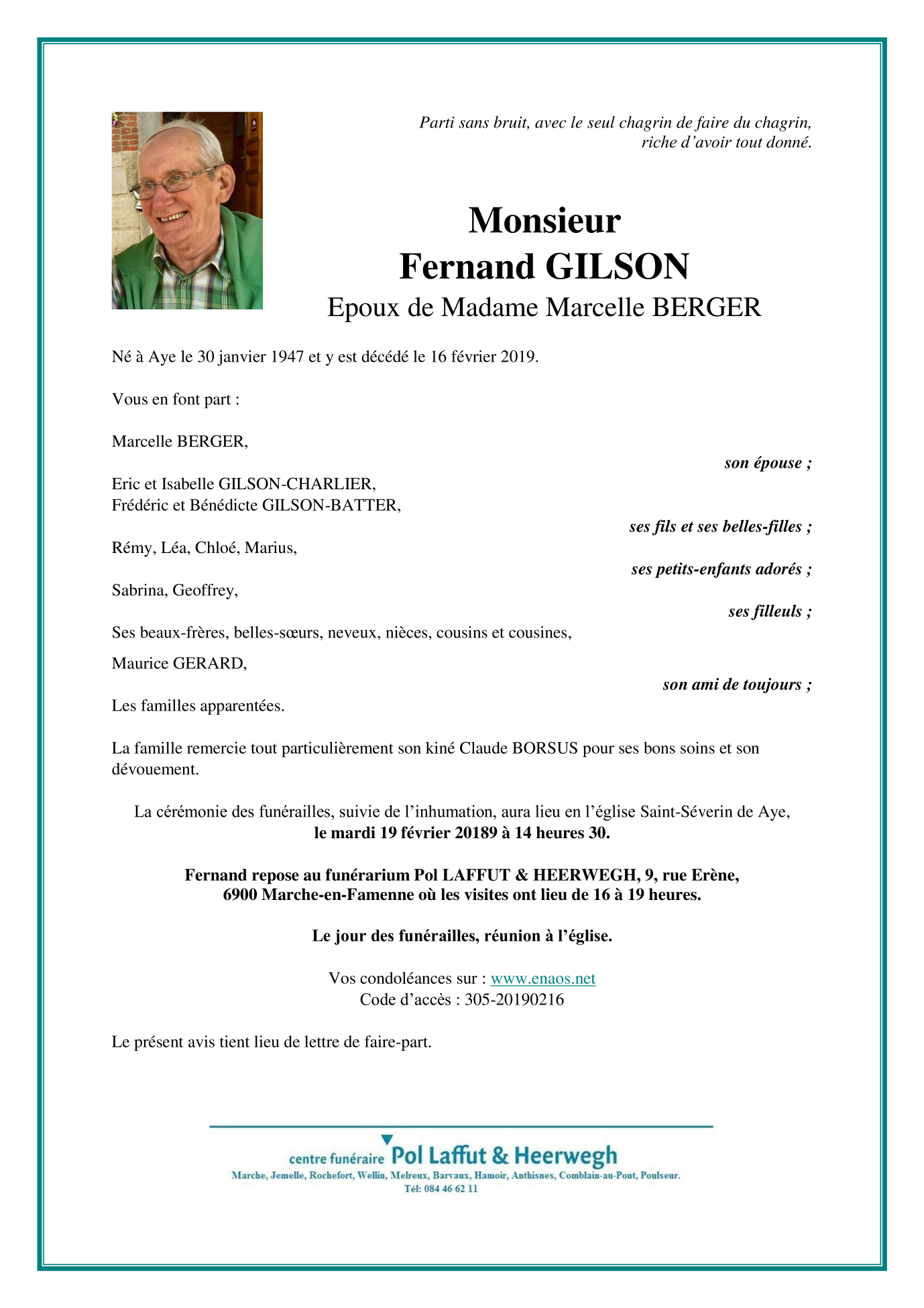 Fallecido en Aye (6900) el sábado, 16 de febrero de 2019 a la edad de 72 años
