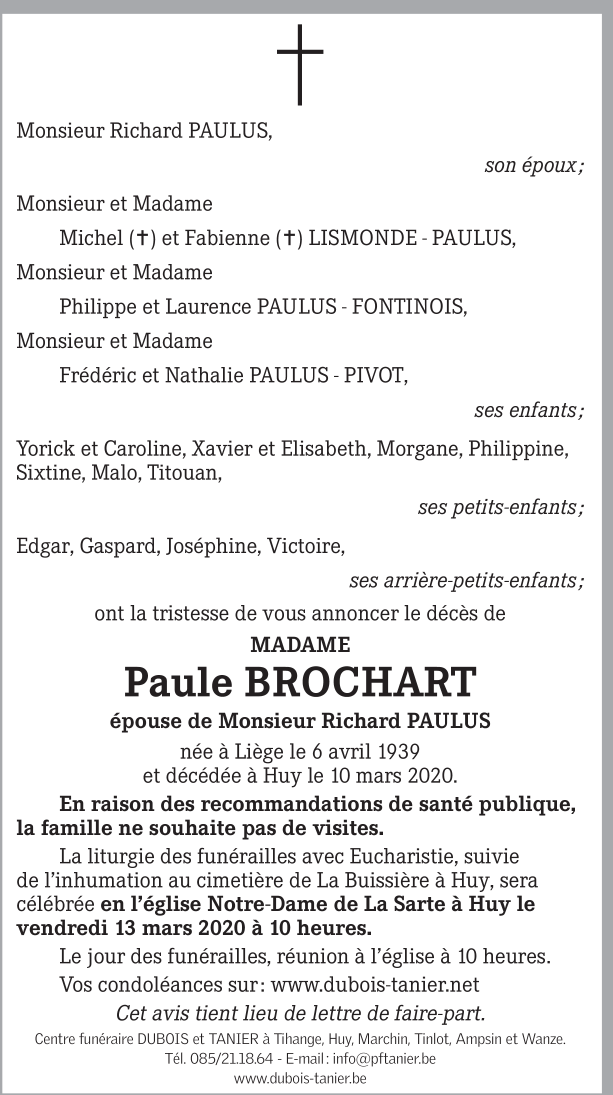 Décédée à Huy (4500) le mardi 10 mars 2020 à l'âge de 80 ans