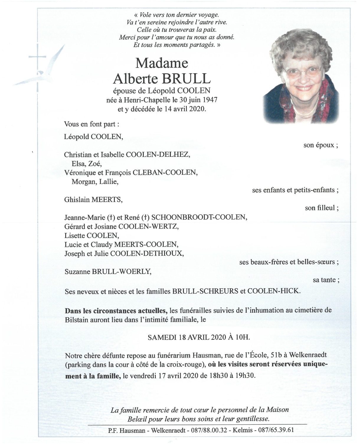 Décédée à Henri-Chapelle (4841) le mardi 14 avril 2020 à l'âge de 72 ans