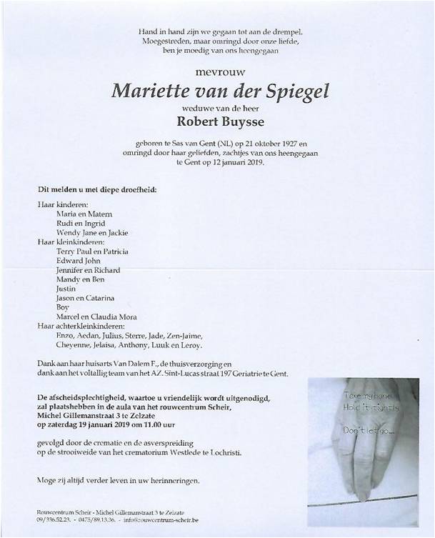Overleden te Gent (9000) op zaterdag 12 januari 2019 op 91-jarige leeftijd