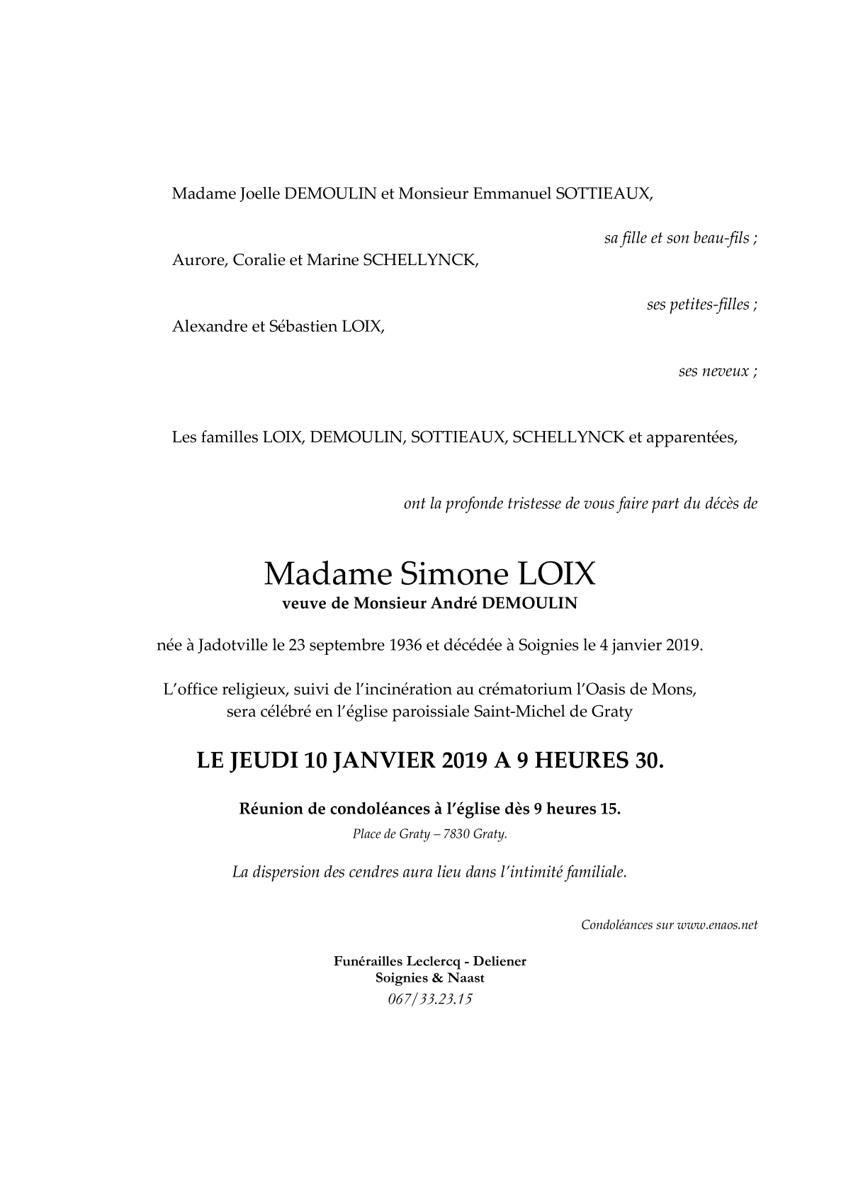 Décédé à Soignies (7060) le vendredi 4 janvier 2019 à l'âge de 82 ans