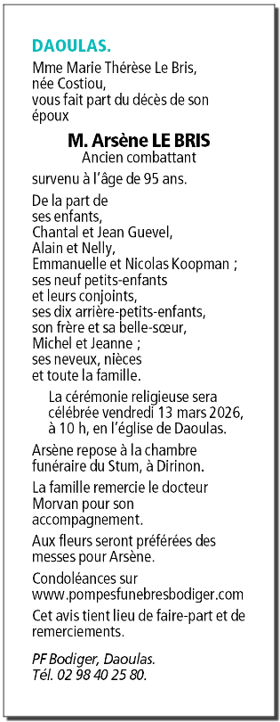 Fallecido en Landerneau (29800, Francia) el domingo, 8 de marzo de 2026 a la edad de 95 años