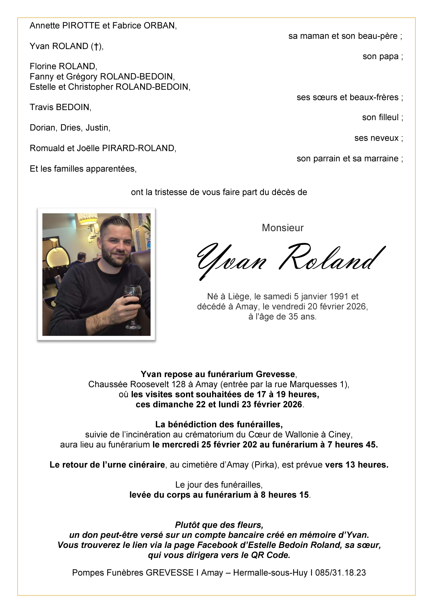 Décédé à Ombret (4540) le vendredi 20 février 2026 à l'âge de 35 ans