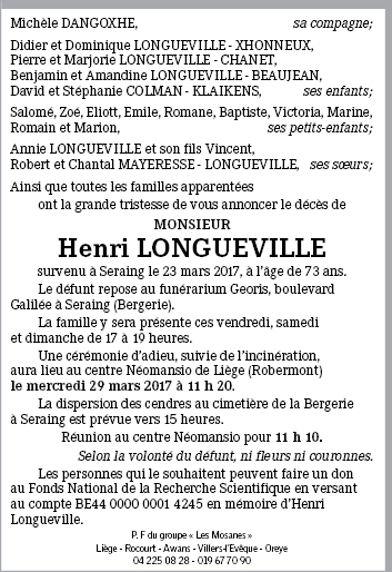 Fallecido en Seraing (4100) el jueves, 23 de marzo de 2017 a la edad de 73 años