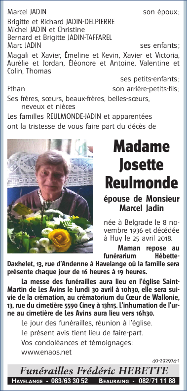 Décédée à Huy (4500) le mercredi 25 avril 2018 à l'âge de 81 ans