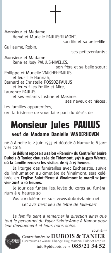 Overleden te Namur (5000) op vrijdag 8 januari 2016 op 82-jarige leeftijd