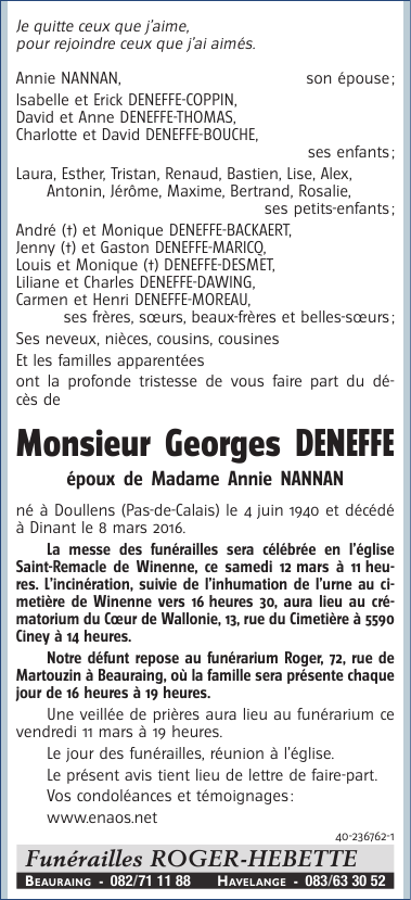 Décédé à Dinant (5500) le mardi 8 mars 2016 à l'âge de 75 ans
