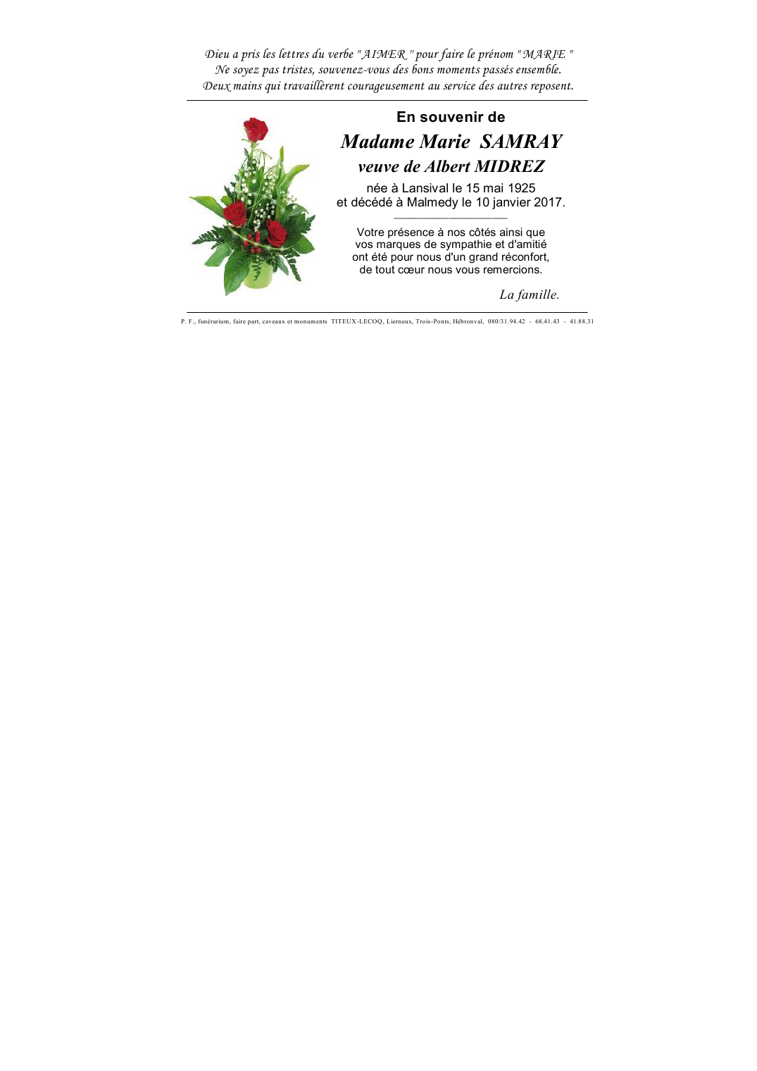 Décédée à Malmedy (4960) le mardi 10 janvier 2017 à l'âge de 91 ans