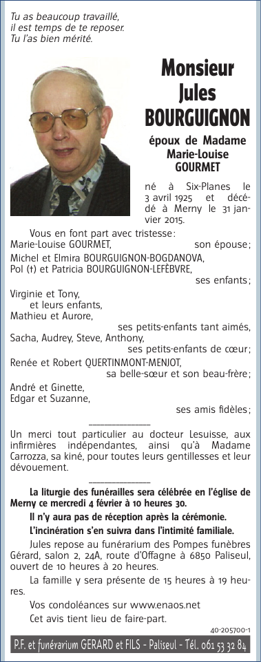 Décédé à Merny (6850) le samedi 31 janvier 2015 à l'âge de 89 ans