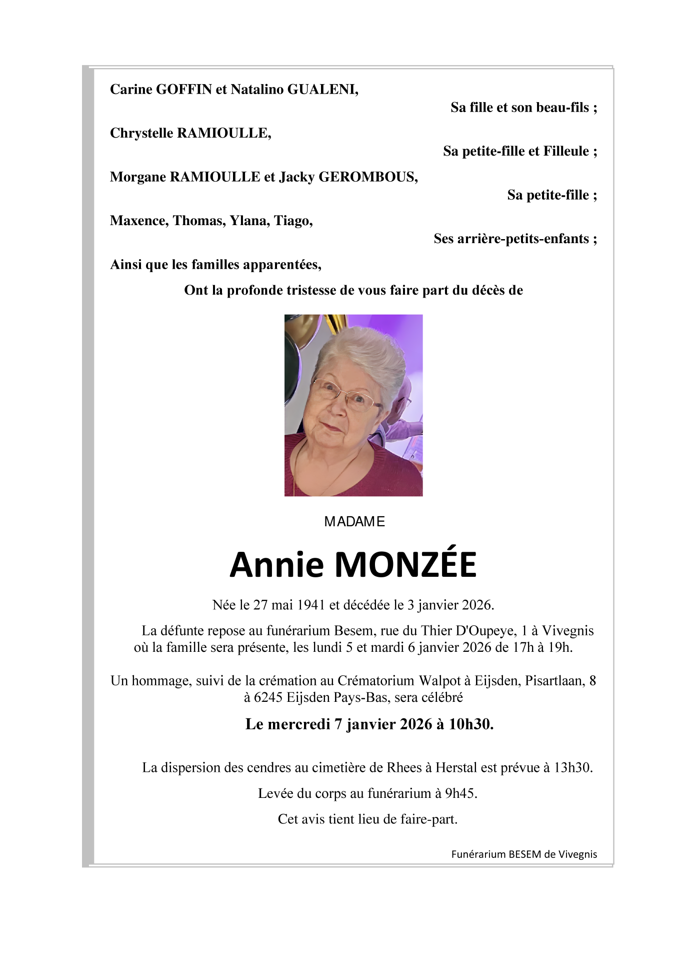 Décédée à Herstal (4040) le samedi 3 janvier 2026 à l'âge de 84 ans