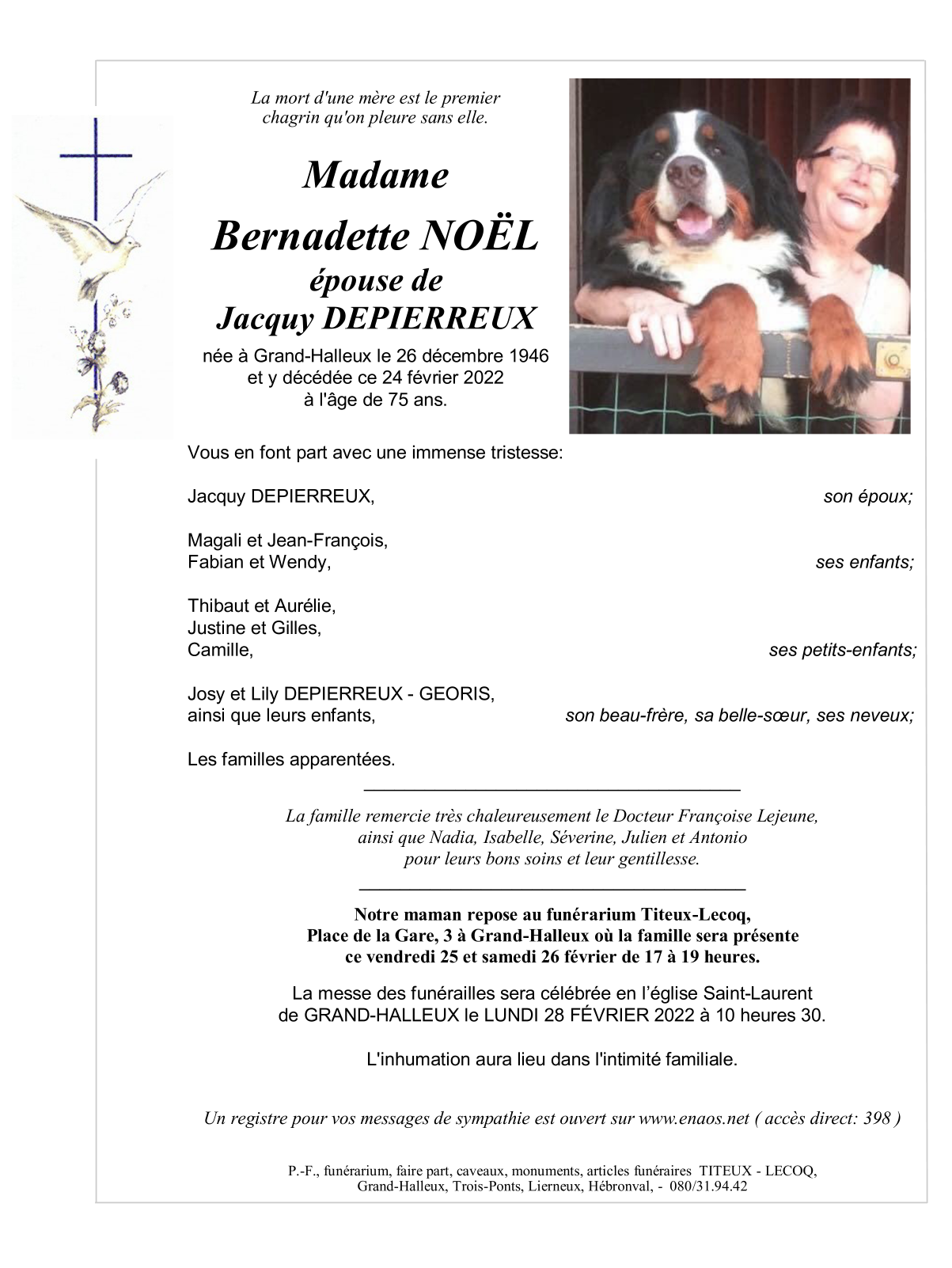 Décédée à Grand-Halleux (6698) le jeudi 24 février 2022 à l'âge de 75 ans