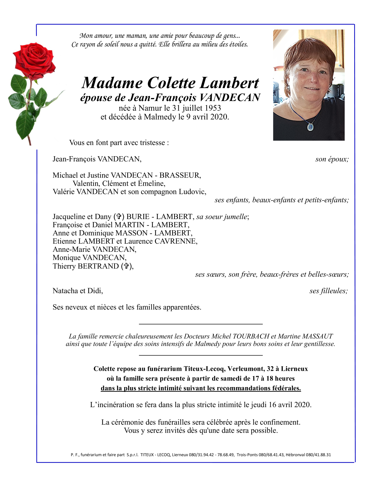 Fallecida en Malmedy (4960) el jueves, 9 de abril de 2020 a la edad de 66 años