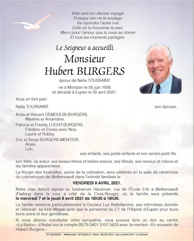 Décédé à Eupen (4700) le lundi 5 avril 2021 à l'âge de 84 ans