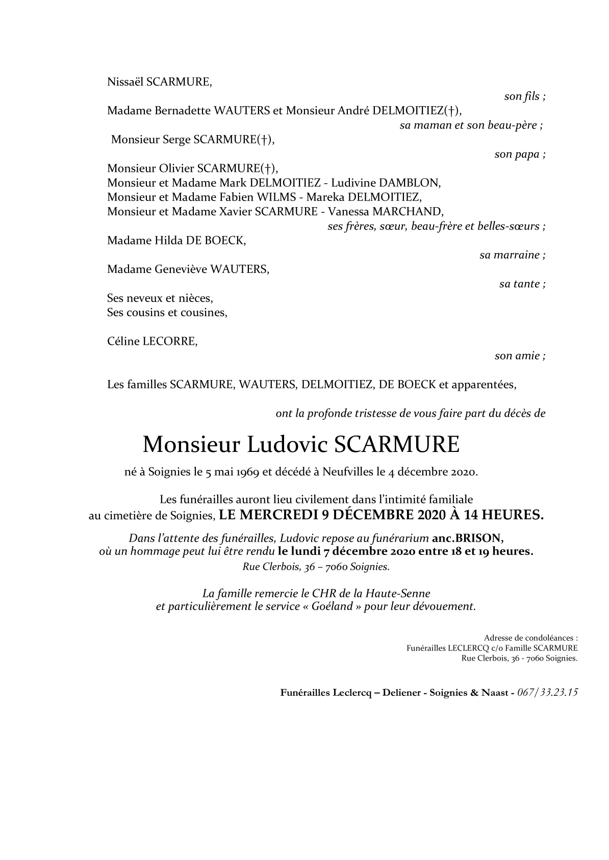 Décédé à Neufvilles (7063) le vendredi 4 décembre 2020 à l'âge de 51 ans