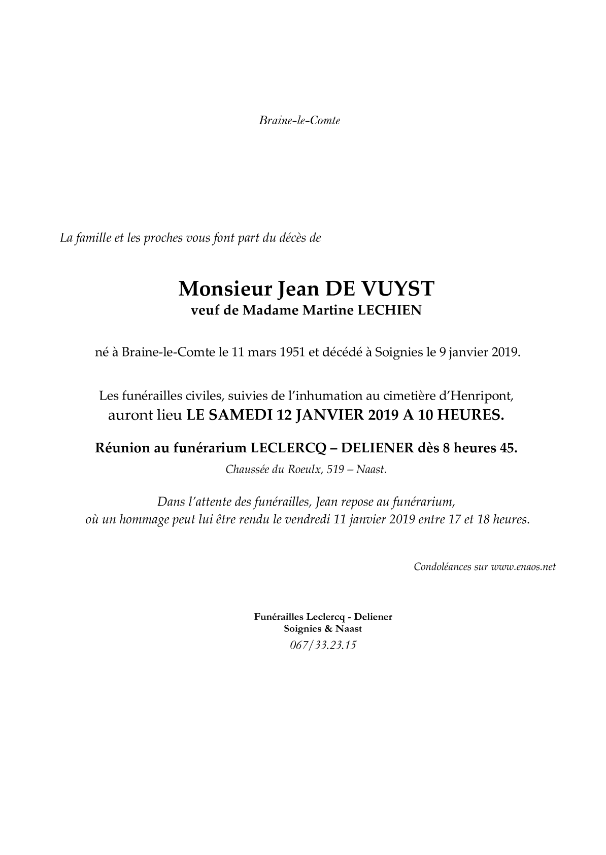 Fallecido en Soignies (7060) el miércoles, 9 de enero de 2019 a la edad de 67 años