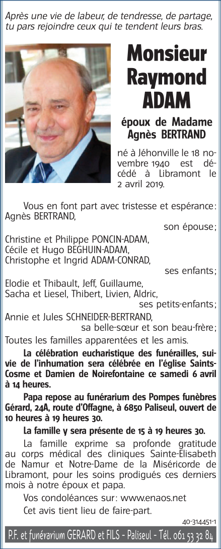 Décédé à Libramont (6800) le mardi 2 avril 2019 à l'âge de 78 ans