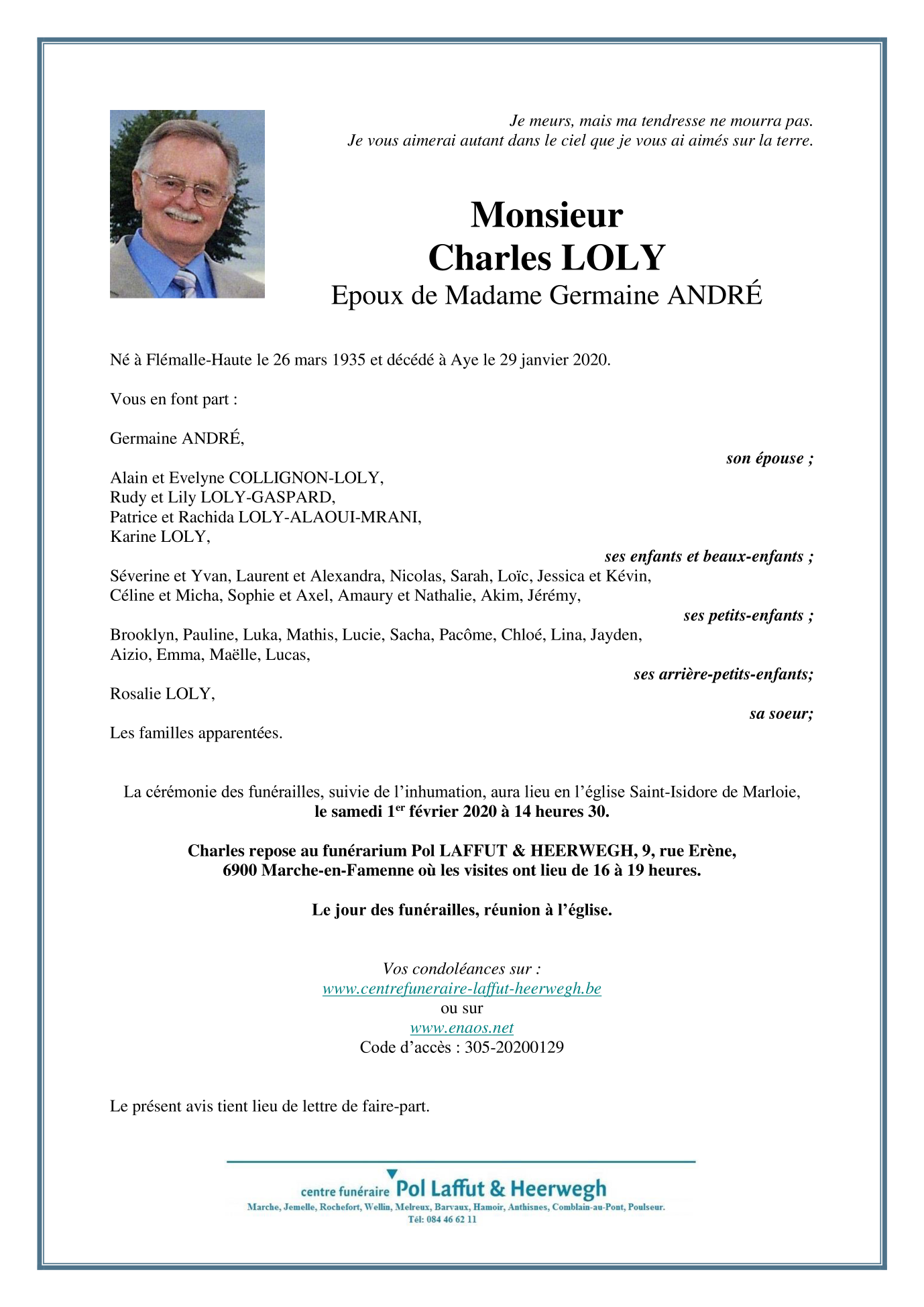 Décédé à Aye (6900) le mercredi 29 janvier 2020 à l'âge de 84 ans