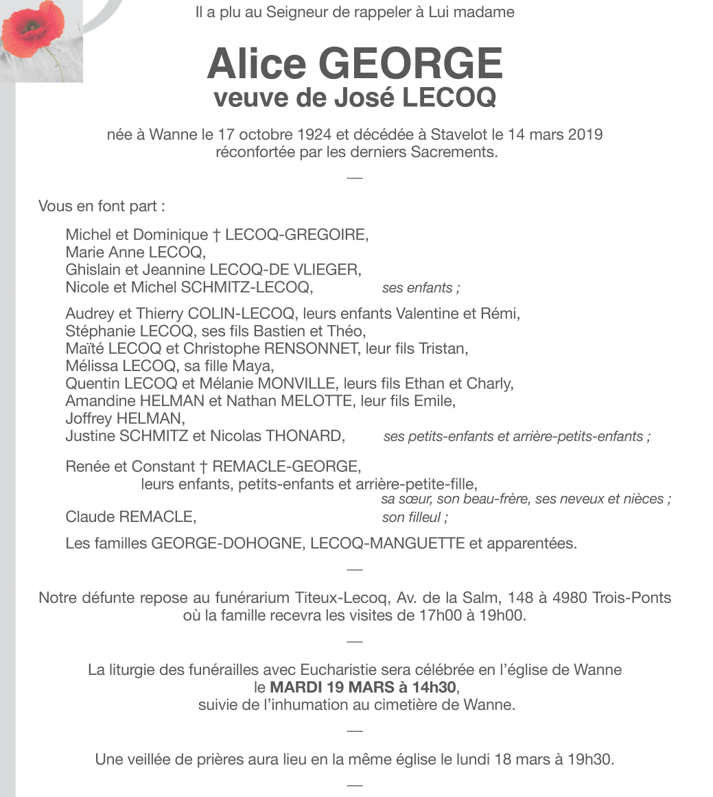 Décédée à Stavelot (4970) le jeudi 14 mars 2019 à l'âge de 94 ans