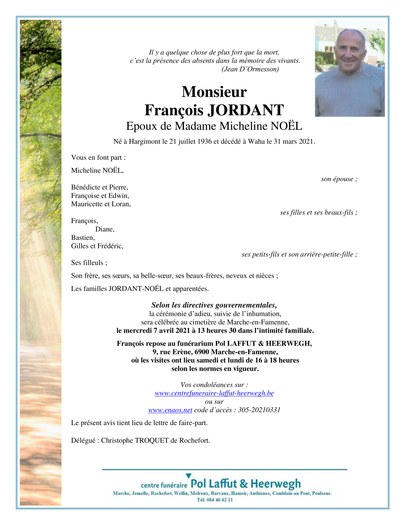 Décédé à Waha (6900) le mercredi 31 mars 2021 à l'âge de 84 ans