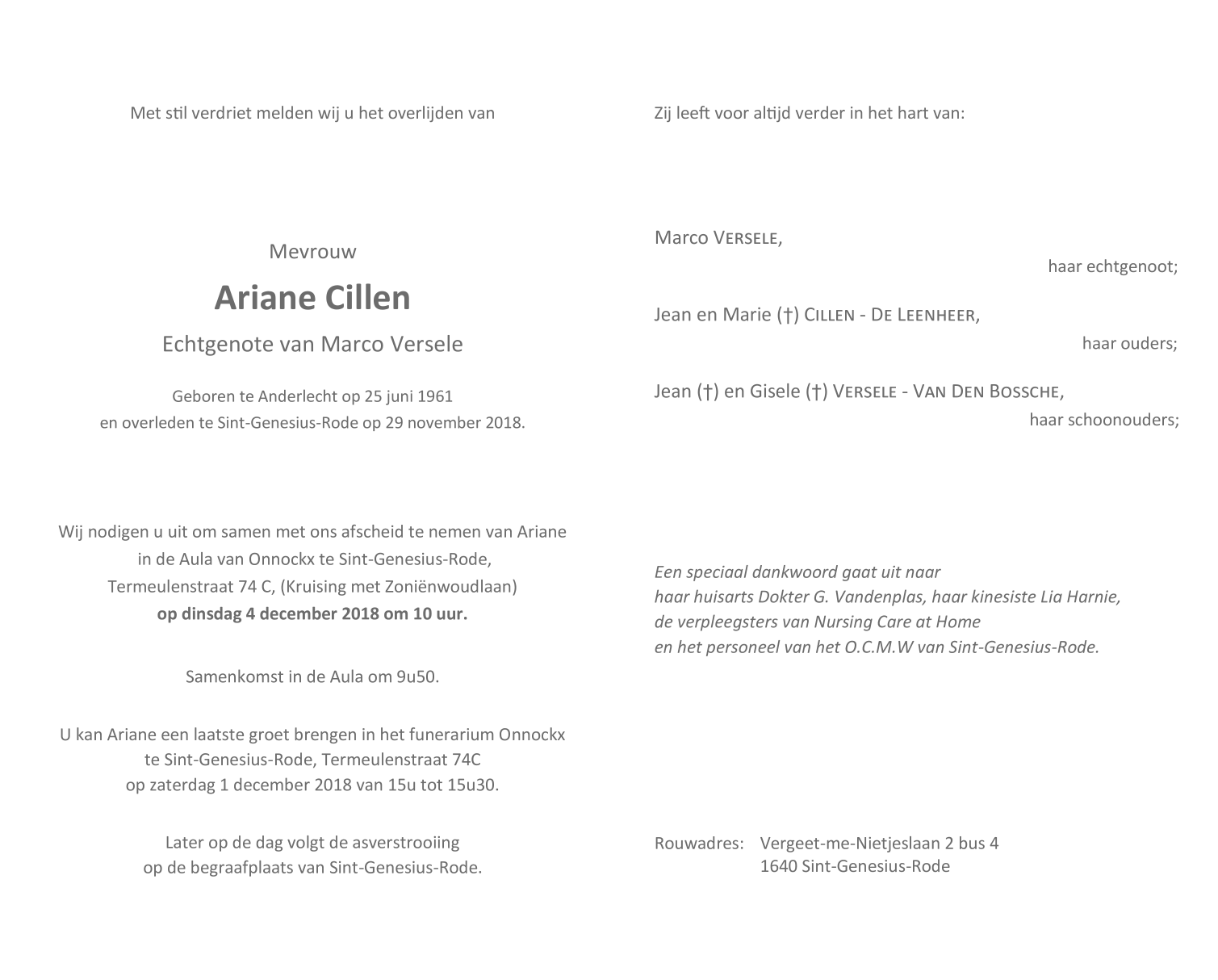 Fallecida en Sint-Genesius-Rode (1640) el jueves, 29 de noviembre de 2018 a la edad de 57 años