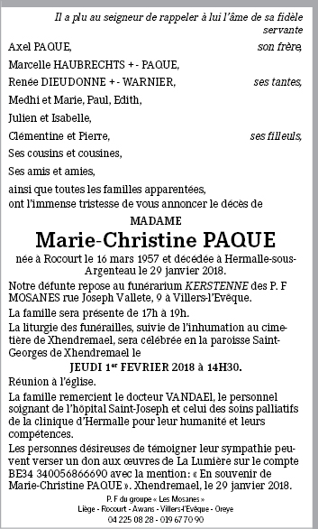 Fallecida en Hermalle-sous-Argenteau (4681) el lunes, 29 de enero de 2018 a la edad de 60 años