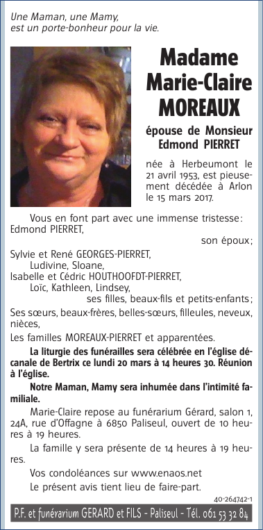 Died in Arlon (6700) on 15 March 2017 at the age of 63 years