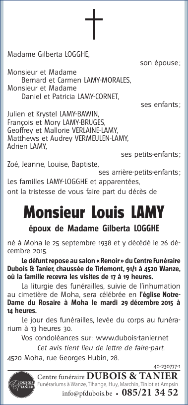 Décédé à Moha (4520) le samedi 26 décembre 2015 à l'âge de 77 ans