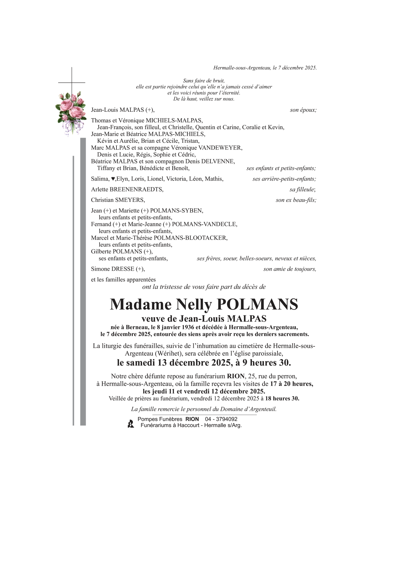 Décédée à Hermalle-sous-Argenteau (4681) le dimanche 7 décembre 2025 à l'âge de 89 ans