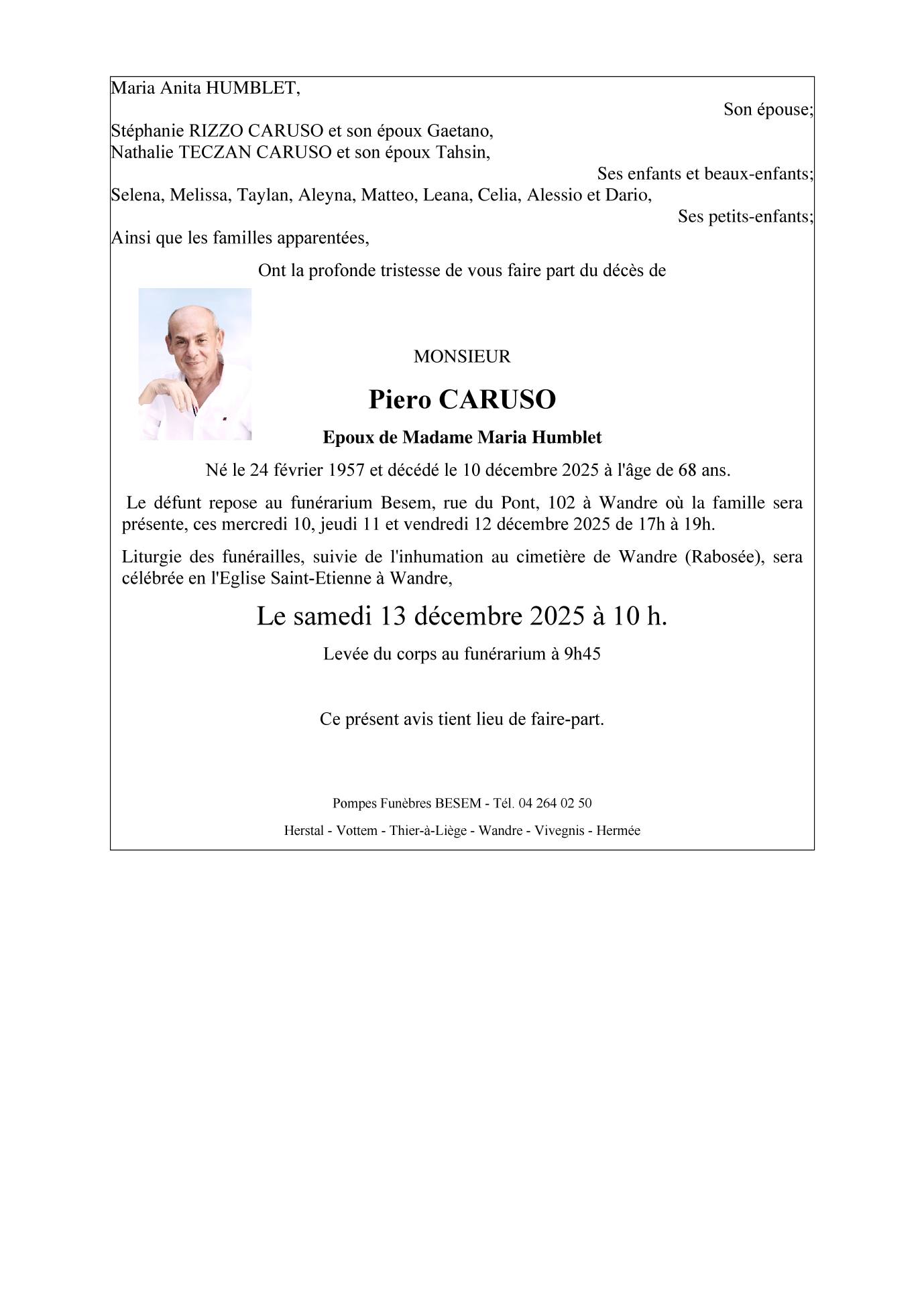 Décédé à Liège (4000) le mercredi 10 décembre 2025 à l'âge de 68 ans