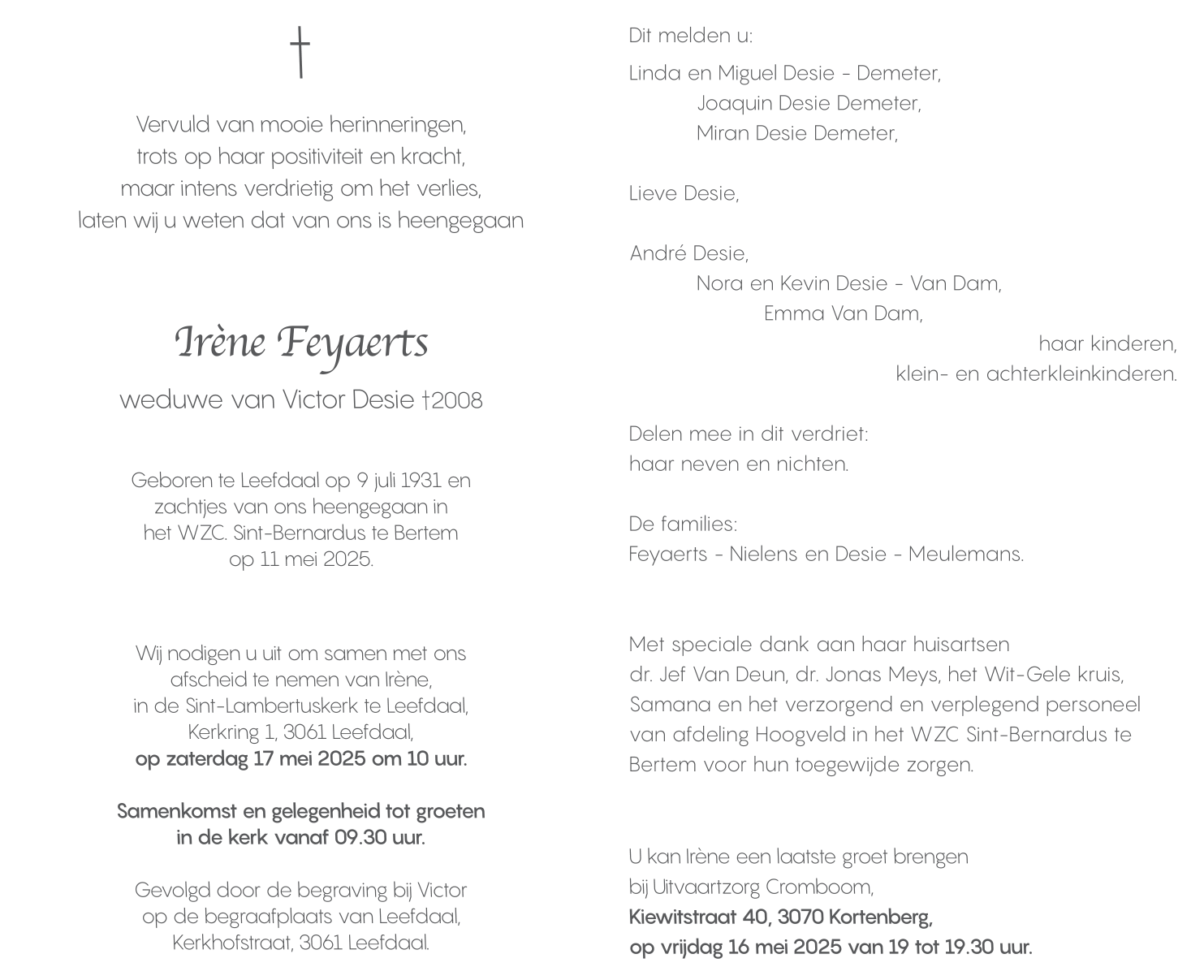 Décédée à Bertem (3060) le dimanche 11 mai 2025 à l'âge de 93 ans