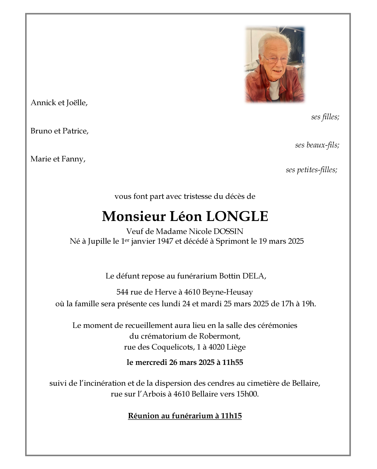 Décédé à Dolembreux (4140) le mercredi 19 mars 2025 à l'âge de 78 ans