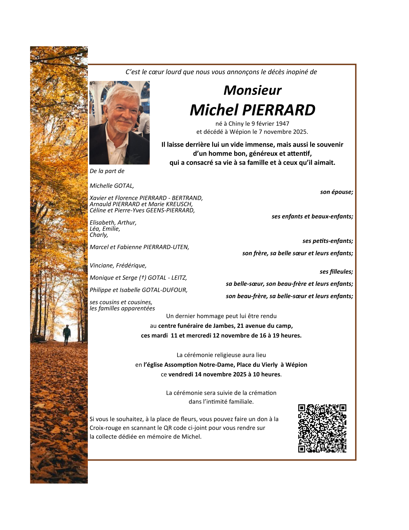 Fallecido en Wépion (5100) el viernes, 7 de noviembre de 2025 a la edad de 78 años