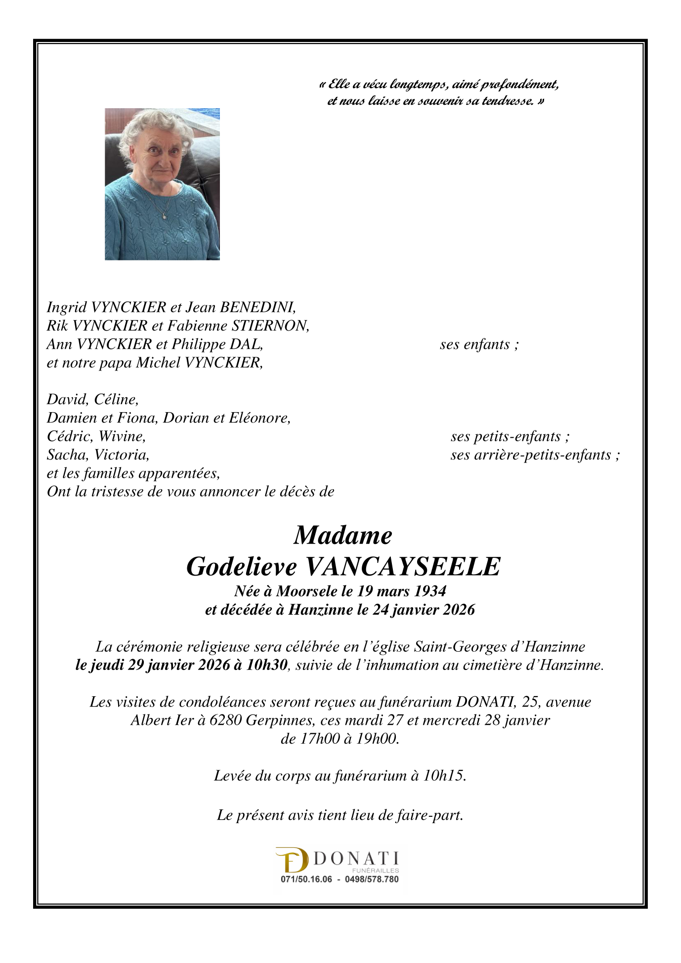 Died in Hanzinne (5621) on 24 January 2026 at the age of 91 years