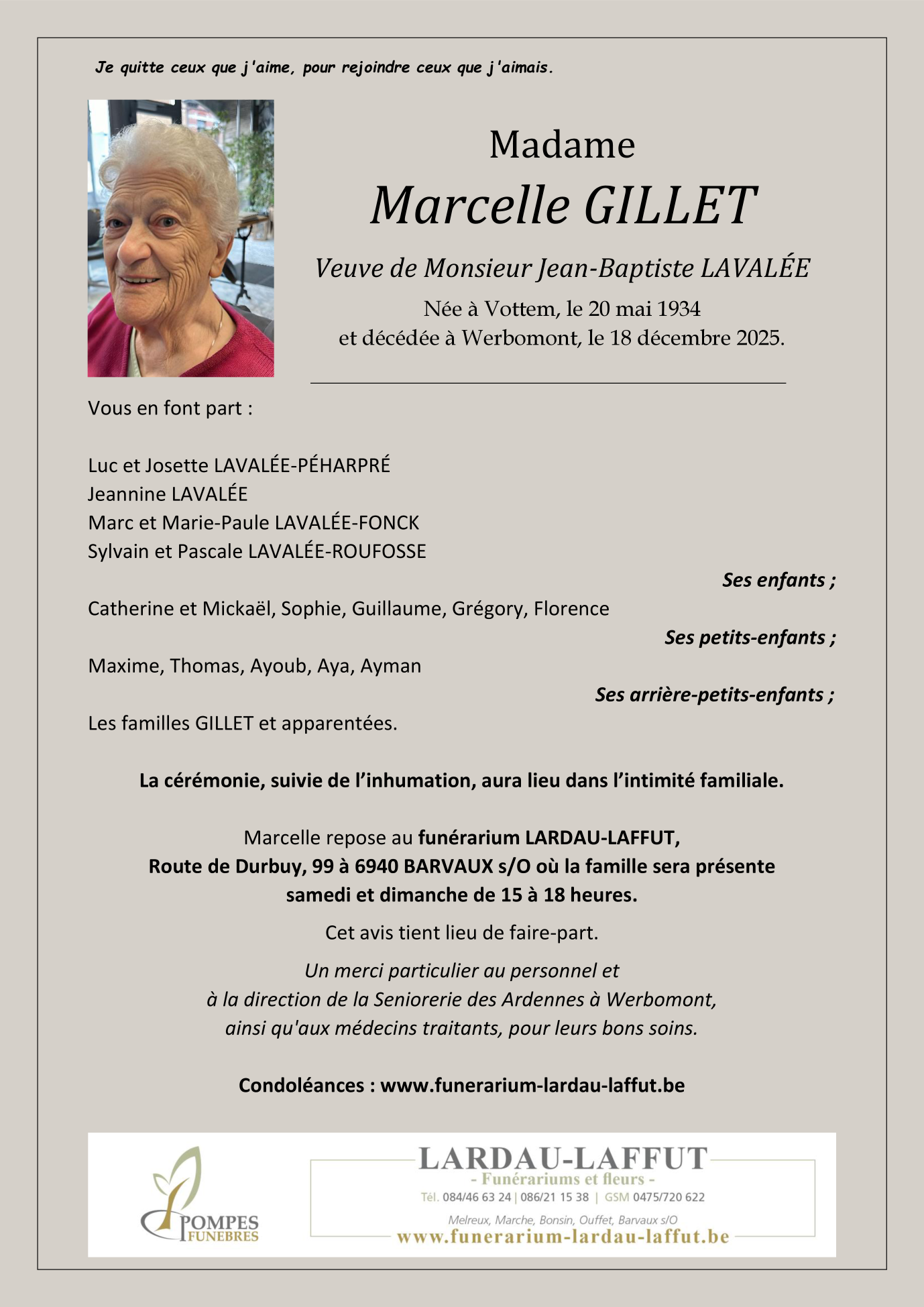 Décédée à Werbomont (4190) le jeudi 18 décembre 2025 à l'âge de 91 ans