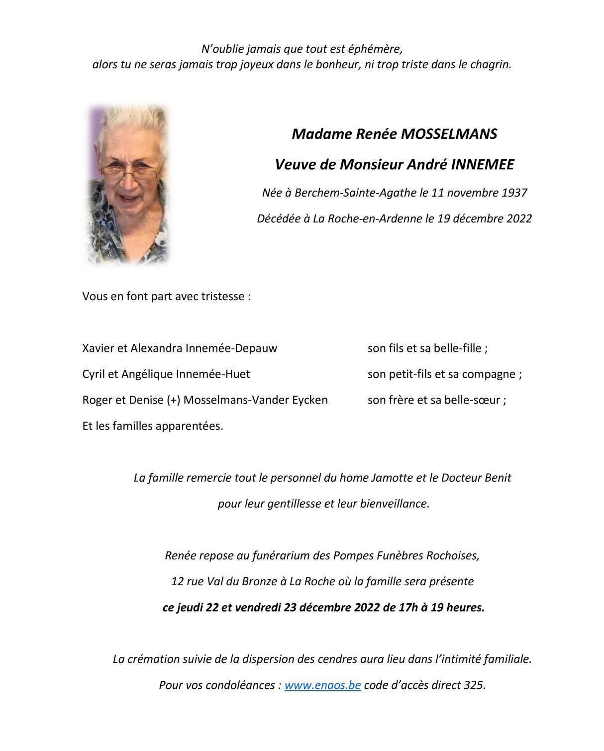 Décédée à La Roche-en-Ardenne (6980) le lundi 19 décembre 2022 à l'âge de 85 ans