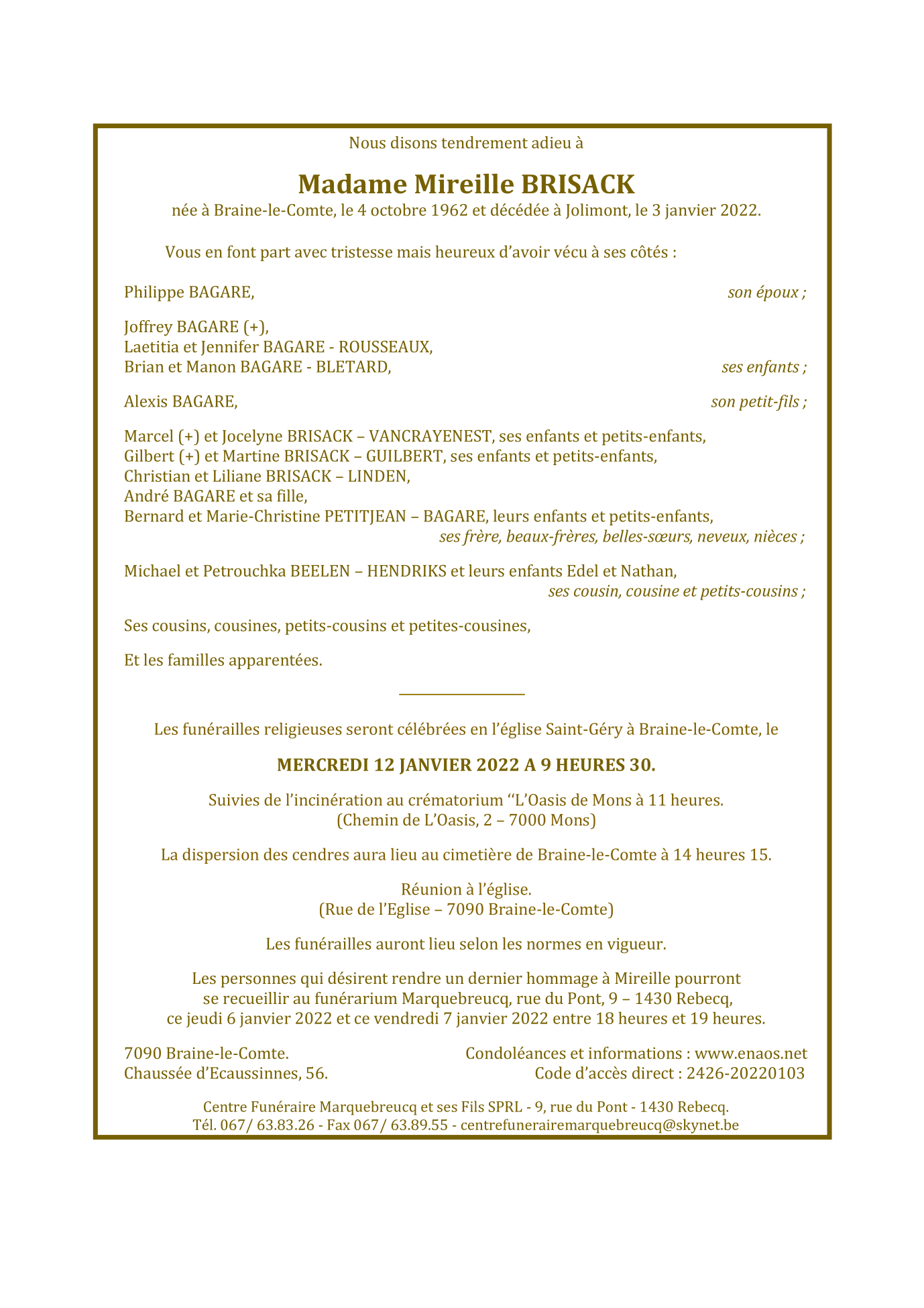 Fallecida en Jolimont (7100) el lunes, 3 de enero de 2022 a la edad de 59 años