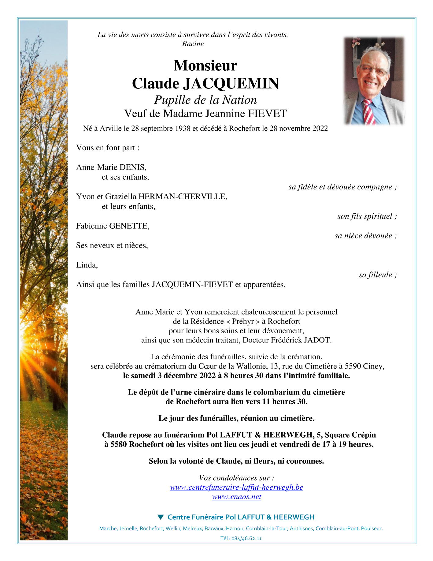 Décédé à Rochefort (5580) le lundi 28 novembre 2022 à l'âge de 84 ans