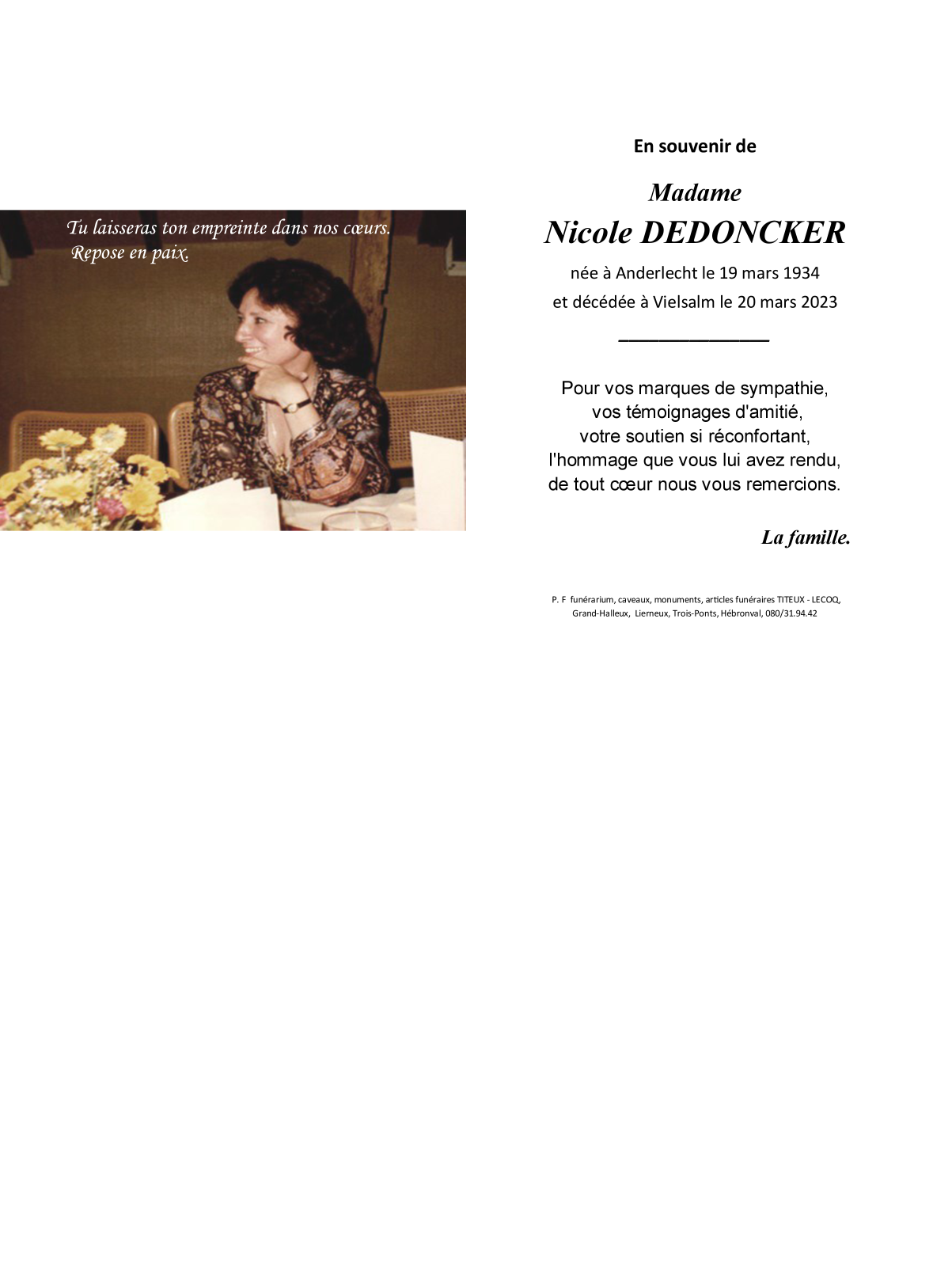 Fallecida en Vielsalm (6690) el sábado, 10 de febrero de 2024 a la edad de 89 años