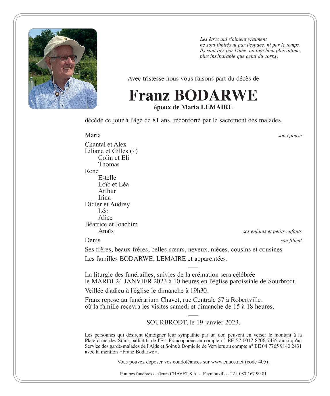 Died in Sourbrodt (4950) on 19 January 2023 at the age of 81 years