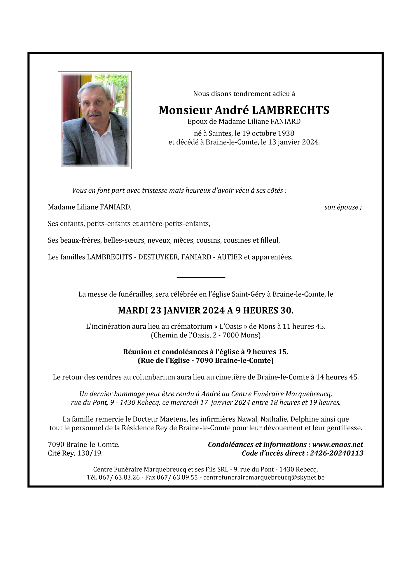 Fallecido en Braine-le-Comte (7090) el sábado, 13 de enero de 2024 a la edad de 85 años