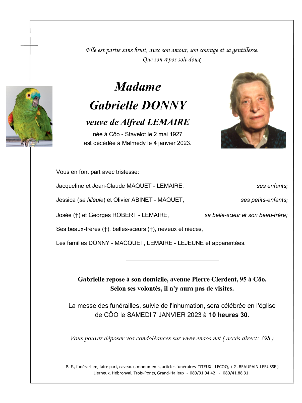 Décédée à Malmedy (4960) le mercredi 4 janvier 2023 à l'âge de 95 ans