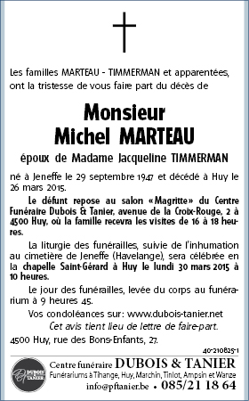 Décédé à Huy (4500) le jeudi 26 mars 2015 à l'âge de 67 ans