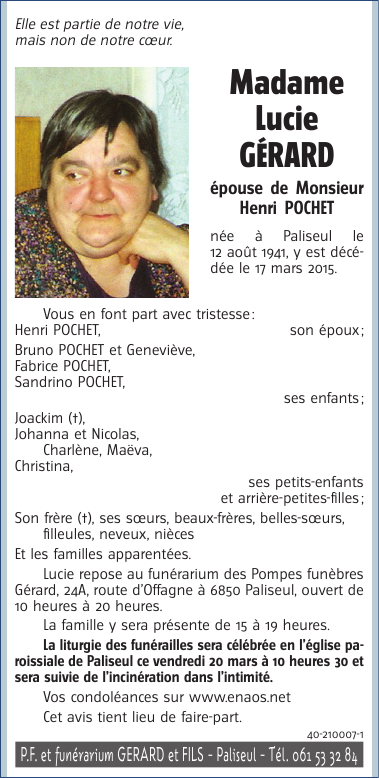 Décédée à Paliseul (6850) le mardi 17 mars 2015 à l'âge de 73 ans