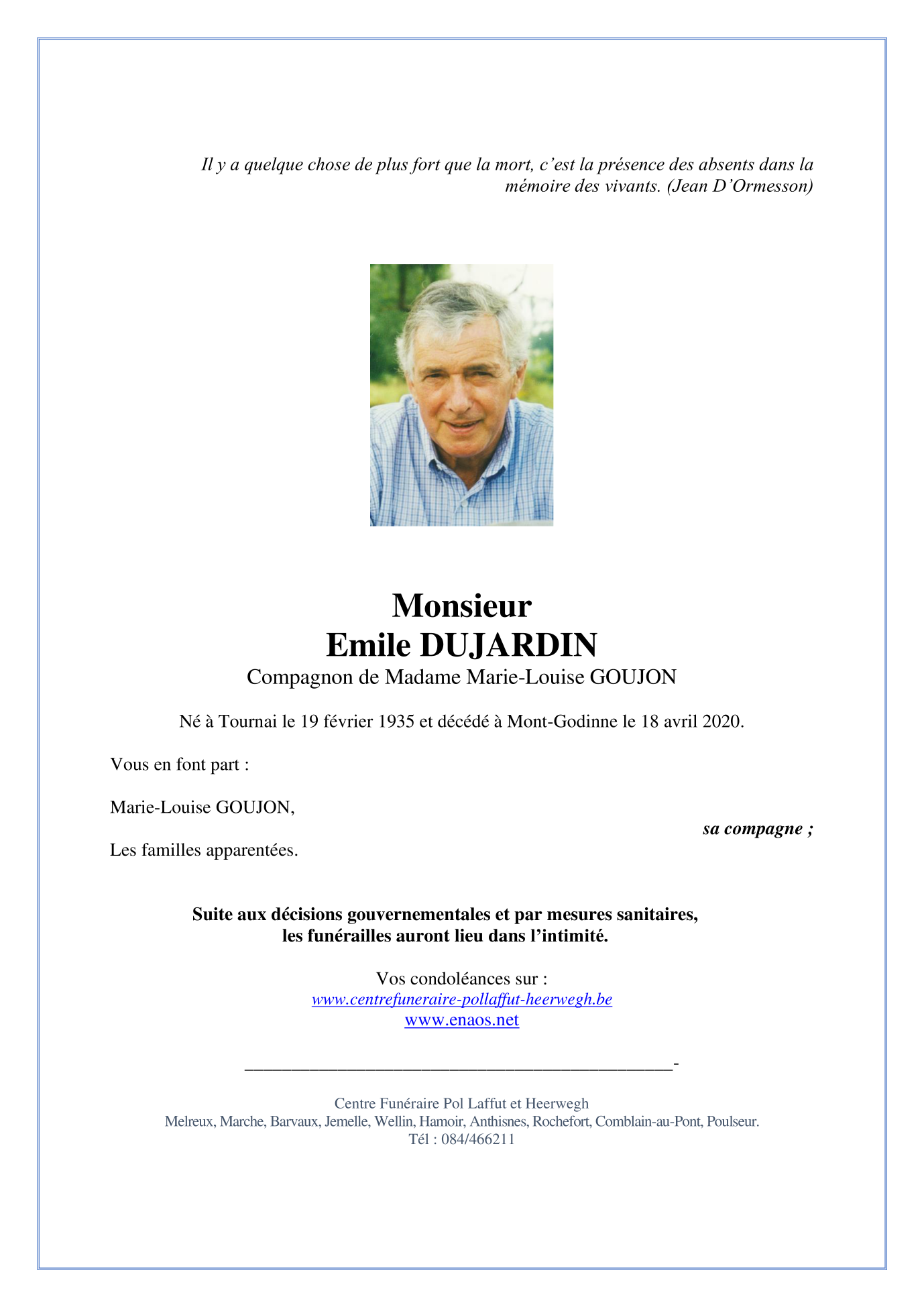 Décédé à Mont-Godinne (5530) le samedi 18 avril 2020 à l'âge de 85 ans