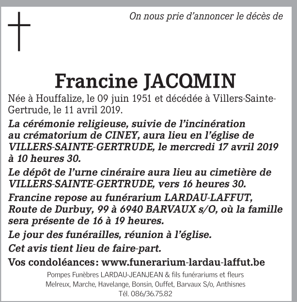 Fallecida en Villers-Sainte-Gertrude (6941) el jueves, 11 de abril de 2019 a la edad de 67 años