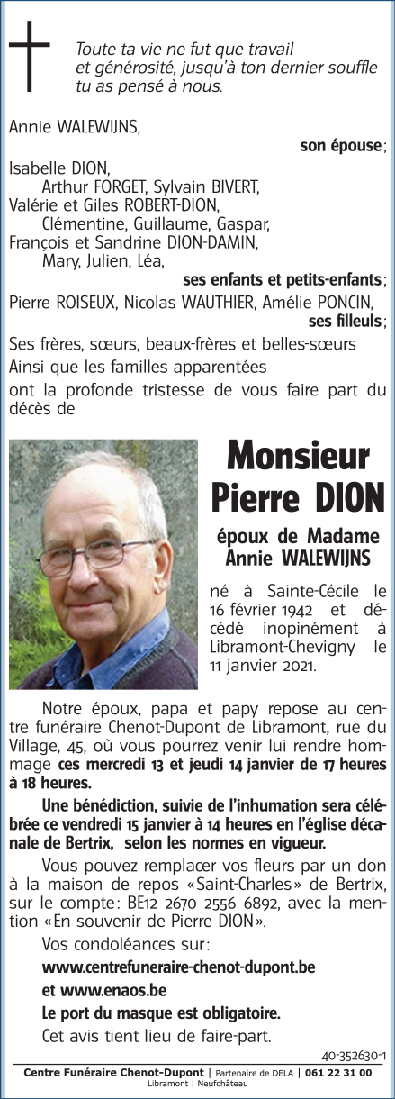 Décédé à Libramont-Chevigny (6800) le lundi 11 janvier 2021 à l'âge de 78 ans