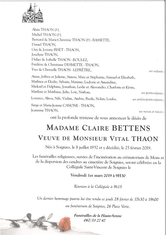 Décédée à Soignies (7060) le lundi 25 février 2019 à l'âge de 86 ans
