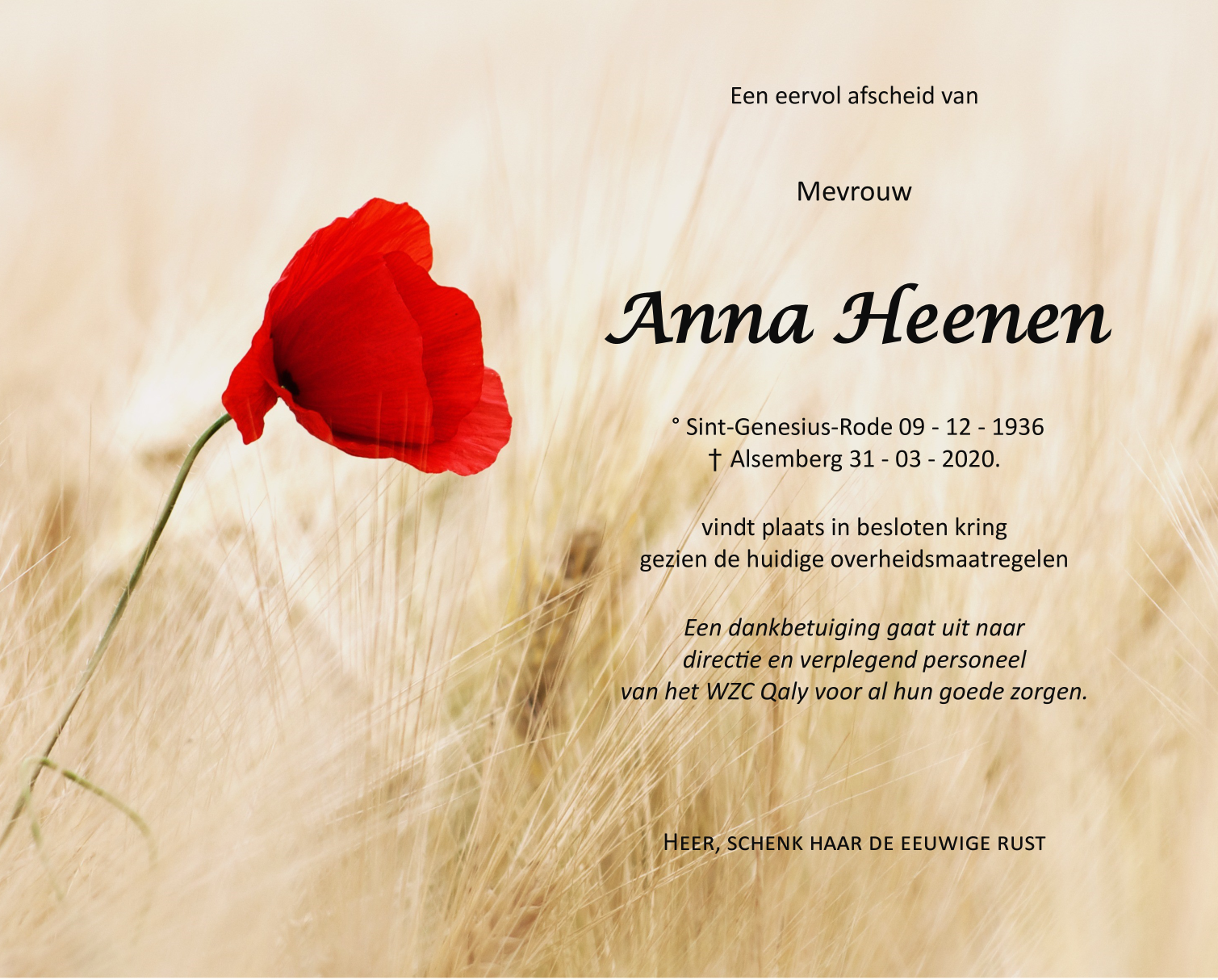 Décédée à Alsemberg (1652) le mardi 31 mars 2020 à l'âge de 83 ans