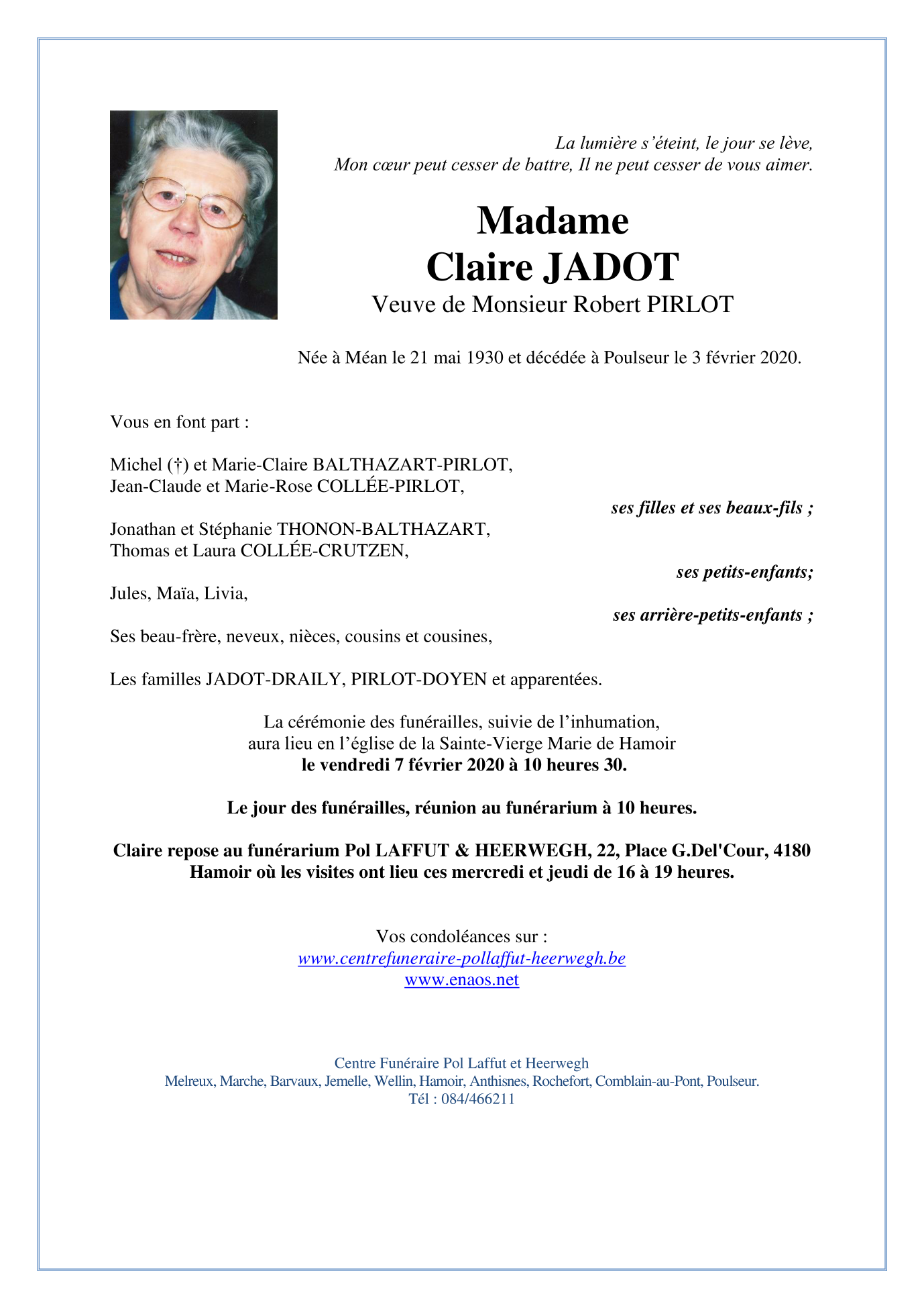 Décédée à Poulseur (4171) le lundi 3 février 2020 à l'âge de 89 ans